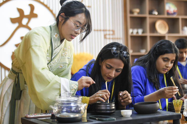 参加“汉语桥”上海合作组织国家青年学生春令营的来华青年学生在新疆师范大学学生(左)的指导下学习茶艺。新华社发
