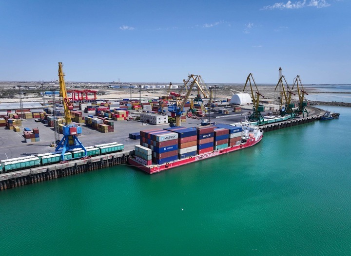 一艘货轮停靠在哈萨克斯坦阿克套港。新华社发